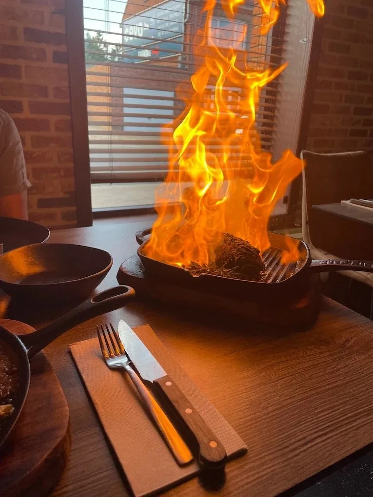 Voor diegene die het wil, flamberen wij ons vlees aan tafel. Hou je camera klaar!